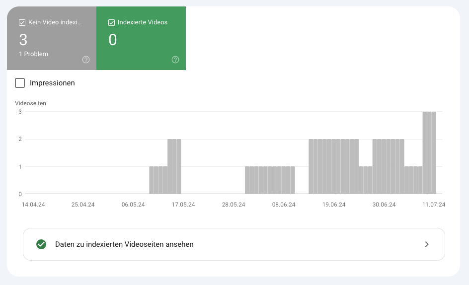 Sobald du Videos auf deiner Website zur Verfügung stellst, werden diese indexiert und hier angezeigt. Auf dieser Website wird ein Problem angezeigt und du kannst prüfen, ob das Problem relevant ist.